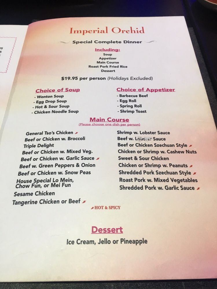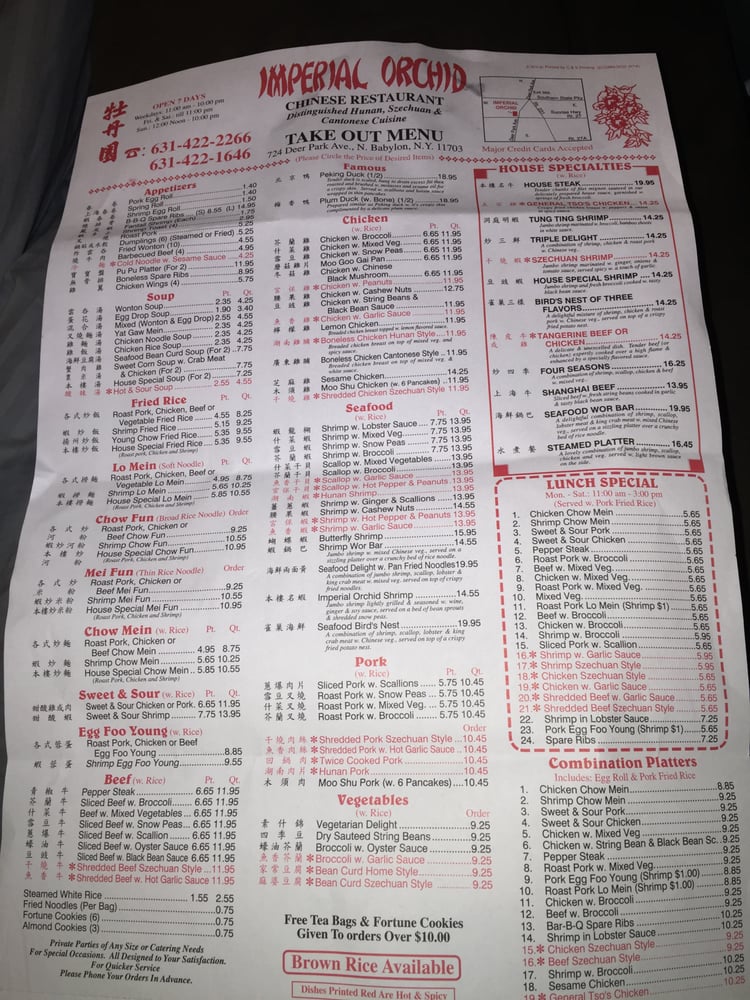 Imperial Orchid in North Babylon, NY, offers a diverse menu of Chinese cuisine, from traditional favorites like pork egg rolls and shrimp toast to unique dishes like Tuna Bomb and Yellow Amazing from the cold Sushi Bar Appetizer selection. The restaurant provides a casual dining experience with options for reservations, delivery, takeout, and catering. Customers praise the attentive staff, delicious food, and welcoming atmosphere. Standout dishes include the scallion pancakes, garlic chicken, and pu pu platter, with many guests returning for the quality and friendly service. Whether you're looking for a quick lunch or a relaxing dinner, Imperial Orchid promises a delightful experience for all. Enjoy a taste of authentic Chinese flavors in a cozy setting at Imperial Orchid.